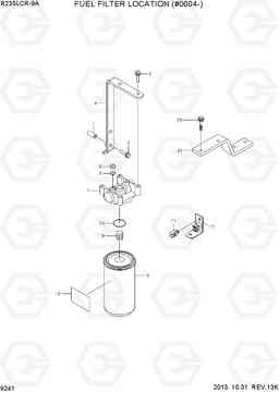 Расположение топливного фильтра (#0004-) экскаватора гусеничного Hyundai R235LCR-9A со списком деталей и комплектацией. Каждую деталь можно приобрести в наличии и под заказ с дотавкой по всей России